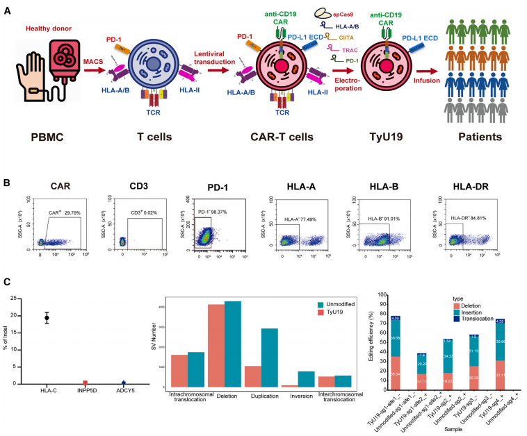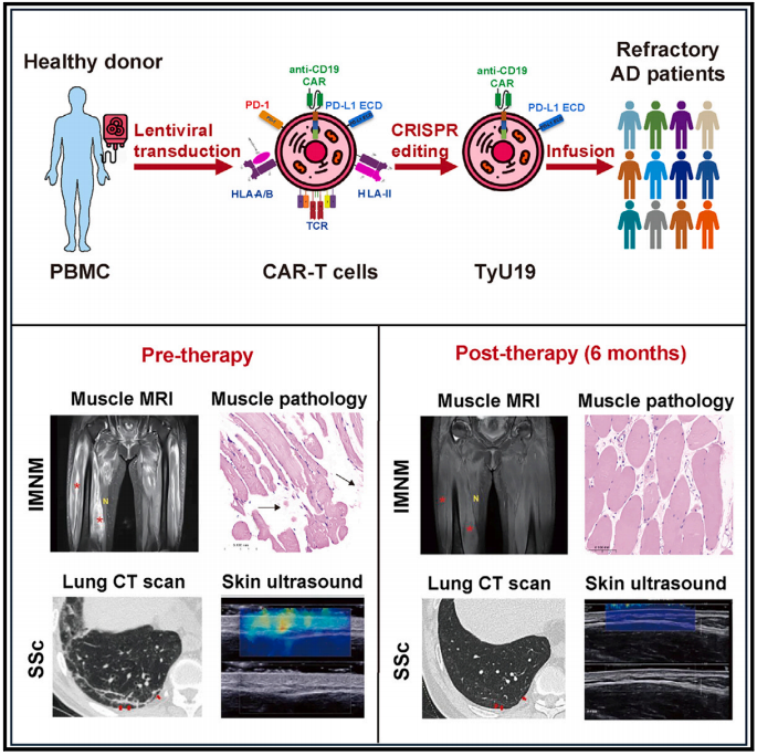 TyU19是一种“off-the-shelf”CAR-T细胞治疗产品,即将来自健康人体的T细胞制备成靶向CD19的CAR-T细胞后,顺利获得CRISPR-Cas9基因编辑技术敲除HLA-A、HLA-B、CIITA、TRAC和PD-1等基因,解决异体CAR-T疗法中免疫排斥的问题。本文报道了TyU19用于治疗1例难治性免疫介导性坏死性肌病(SPR-IMNM)患者和2例弥漫性皮肤系统性硬化症(dcSSc)患者,输注的TyU19在体内持续存在超过3个月,实现了完全B细胞耗竭。在6个月的随访期内,患者未出现细胞因子释放综合征或其他严重不良事件,相应疾病的临床反应指数评分显著改善,达到深度缓解。