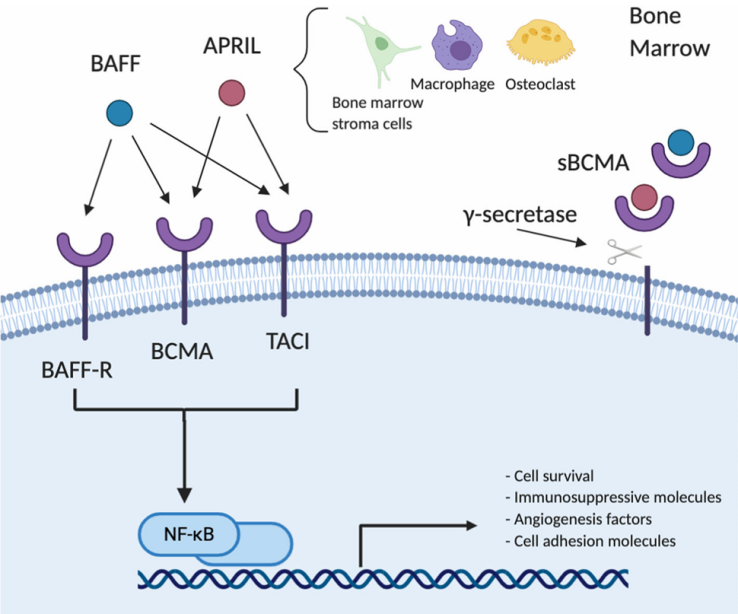 BCMA的主要配体是:B细胞活化因子(BAFF)和增殖诱导配体(APRIL),它们主要由骨髓基质细胞、破骨细胞和巨噬细胞以旁分泌的方式分泌。配体与BCMA结合后,MM细胞中多个生长和存活信号级联被激活,最常见的是活化B细胞的核因子κ-轻链增强子(NF-κβ),这些途径顺利获得调节细胞周期检查点导致MM细胞存活率增加[4]